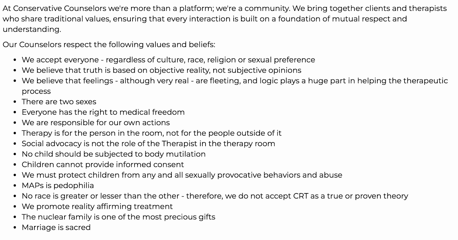 And they’re out there. Websites like Conservative Counselors provide directories of therapists who have committed to the following core beliefs: